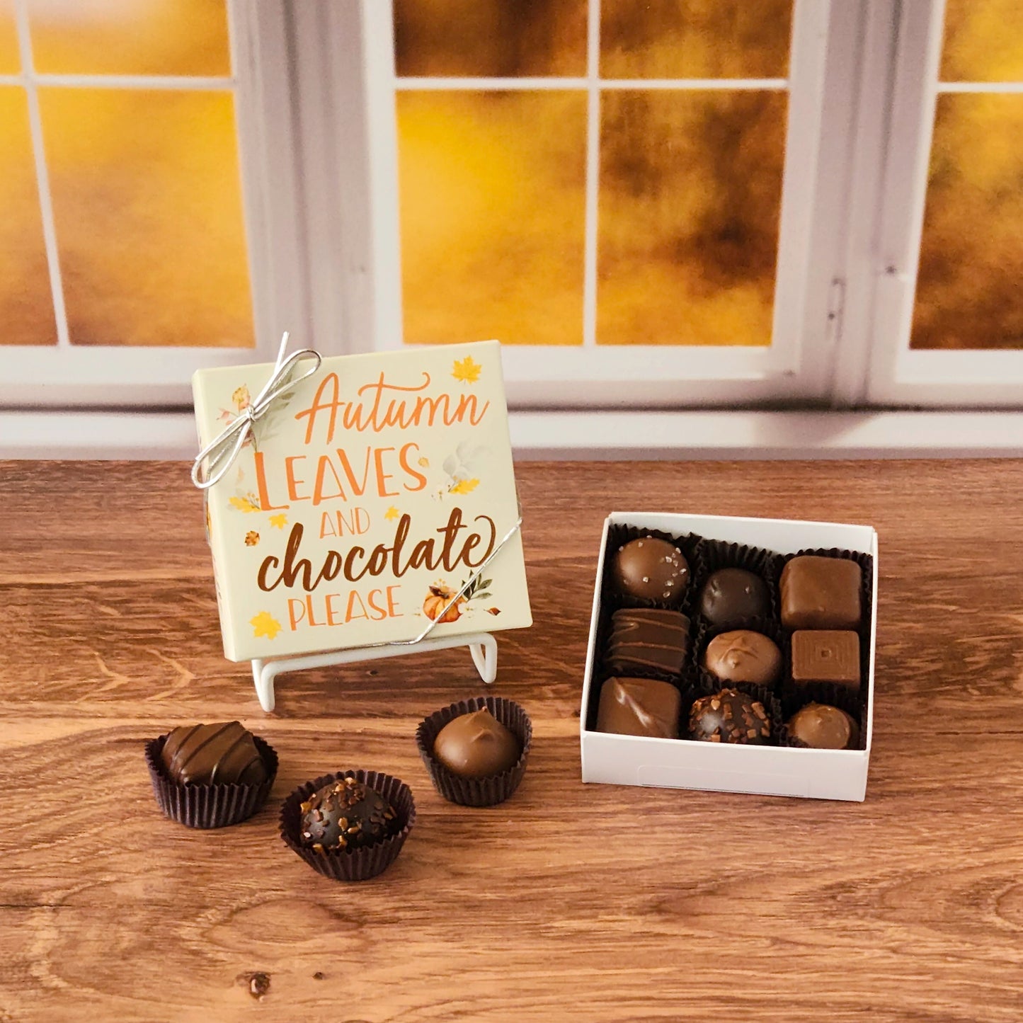 Tucked inside the charming fall-themed box—decorated in warm autumn colors and topped with the phrase “Autumn Leaves and Chocolate Please”—you’ll find a carefully curated mix of silky milk and bold dark chocolates. Each piece is a bite of bliss: smooth caramels, dreamy meltaways, soft creams, and decadent truffles, all made in small batches for that just-made freshness and flavor. Available in your choice of 9 or 16 pieces, it’s the perfect size for gifting or indulging.
