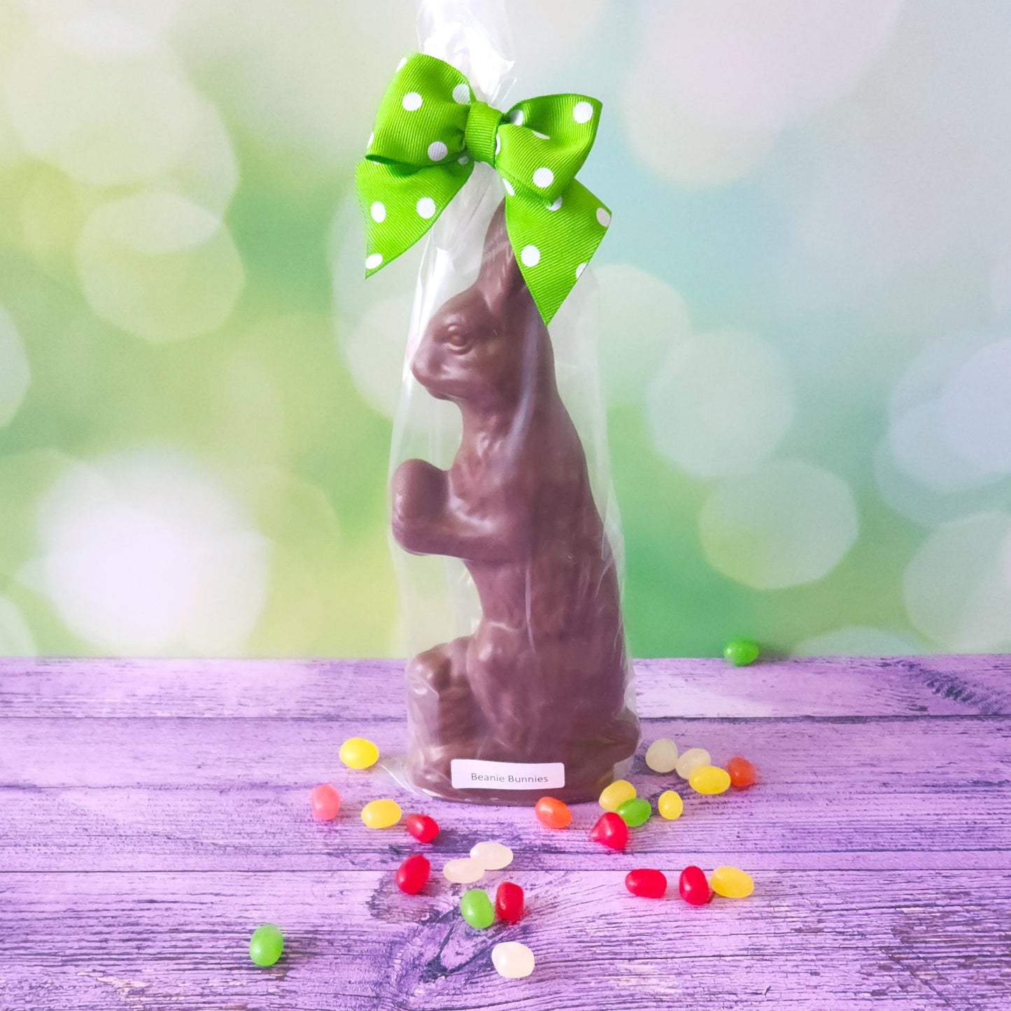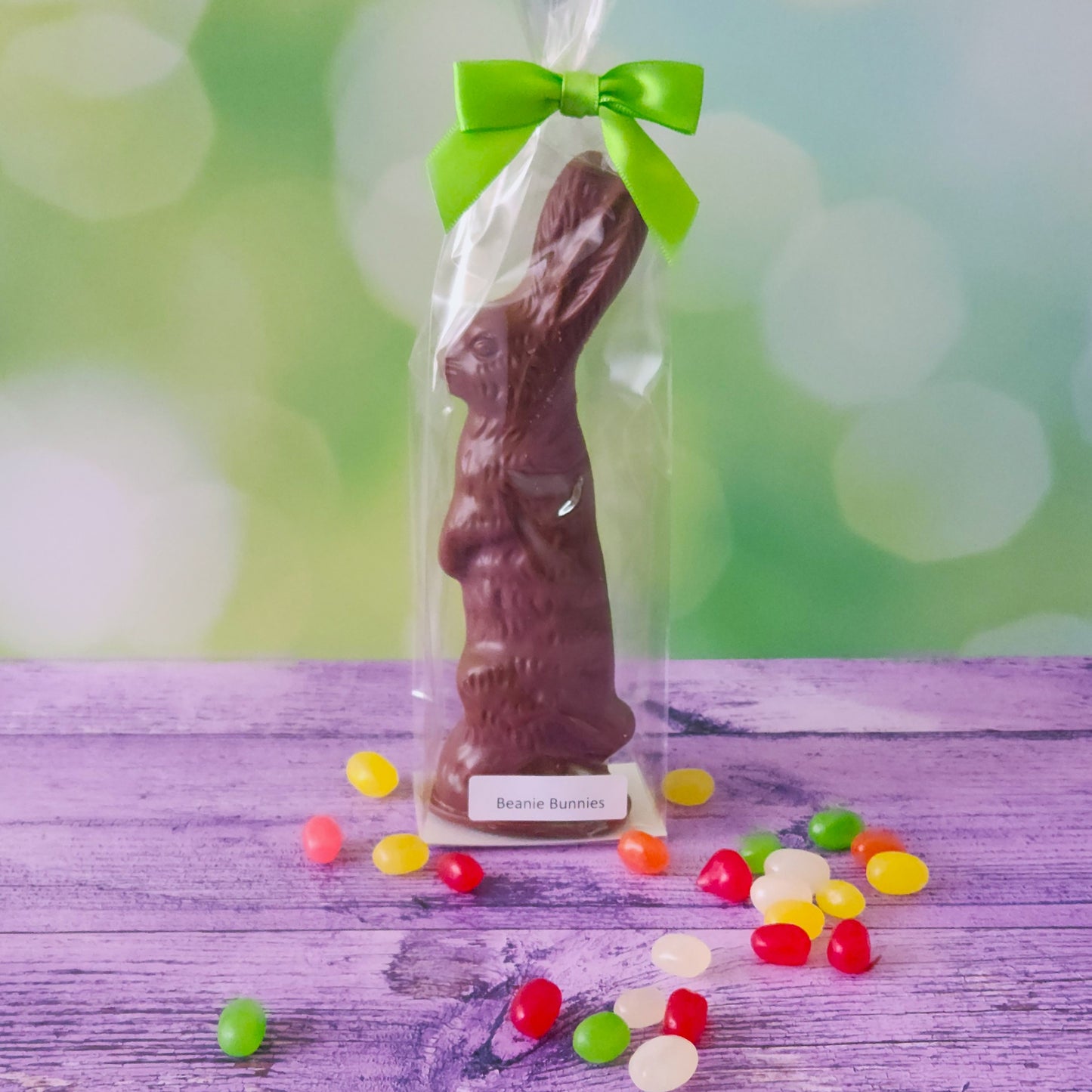 Hop into the joy of spring with our Beanie Bunny—a delightful milk chocolate rabbit that’s more than meets the eye! Available in two fun sizes (Small and Large), each bunny is crafted with creamy, rich milk chocolate and filled with fruit-flavored pectin jelly beans for a burst of juicy sweetness in every bite.
