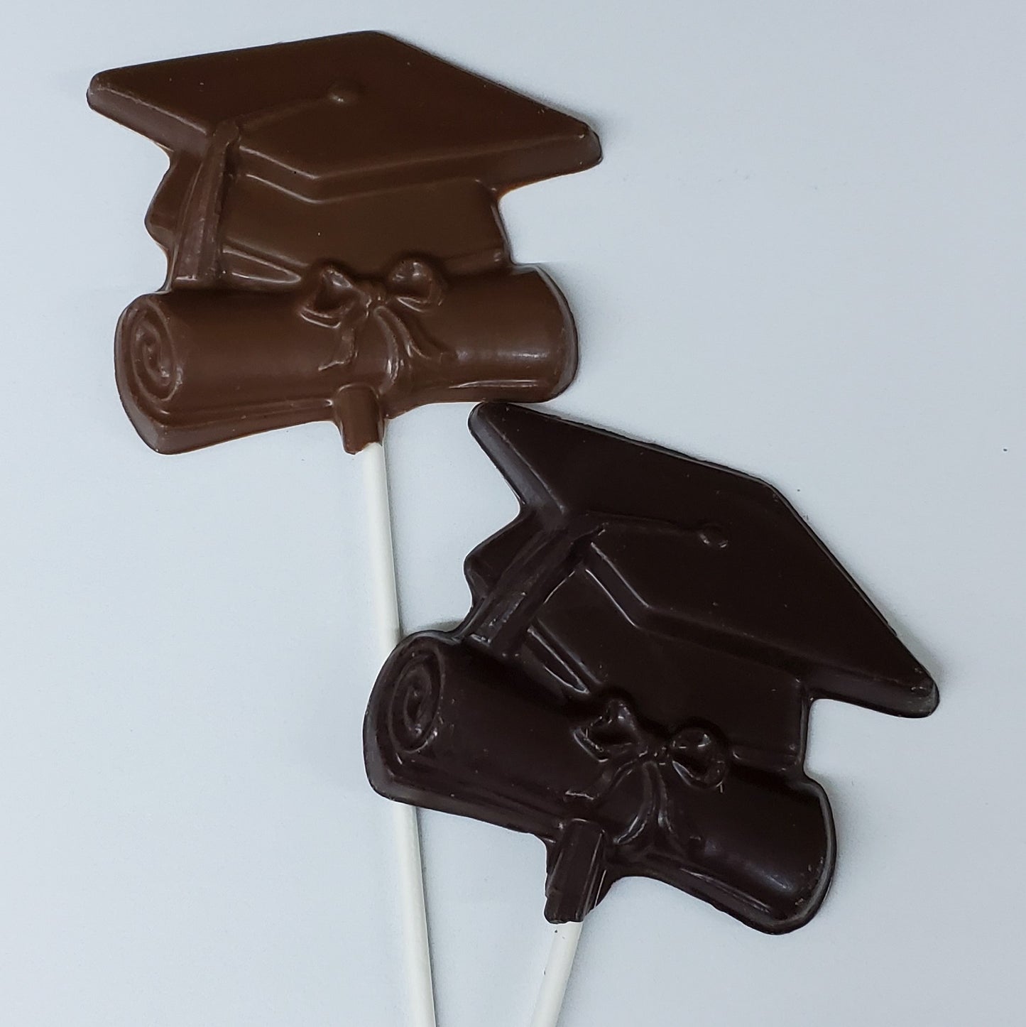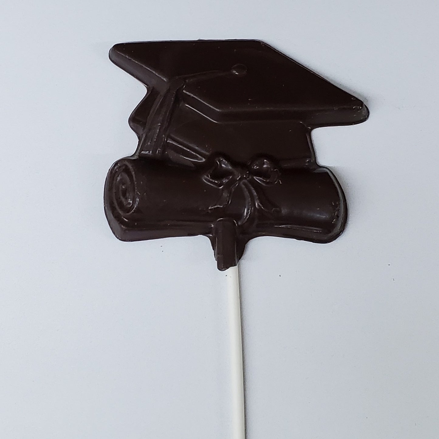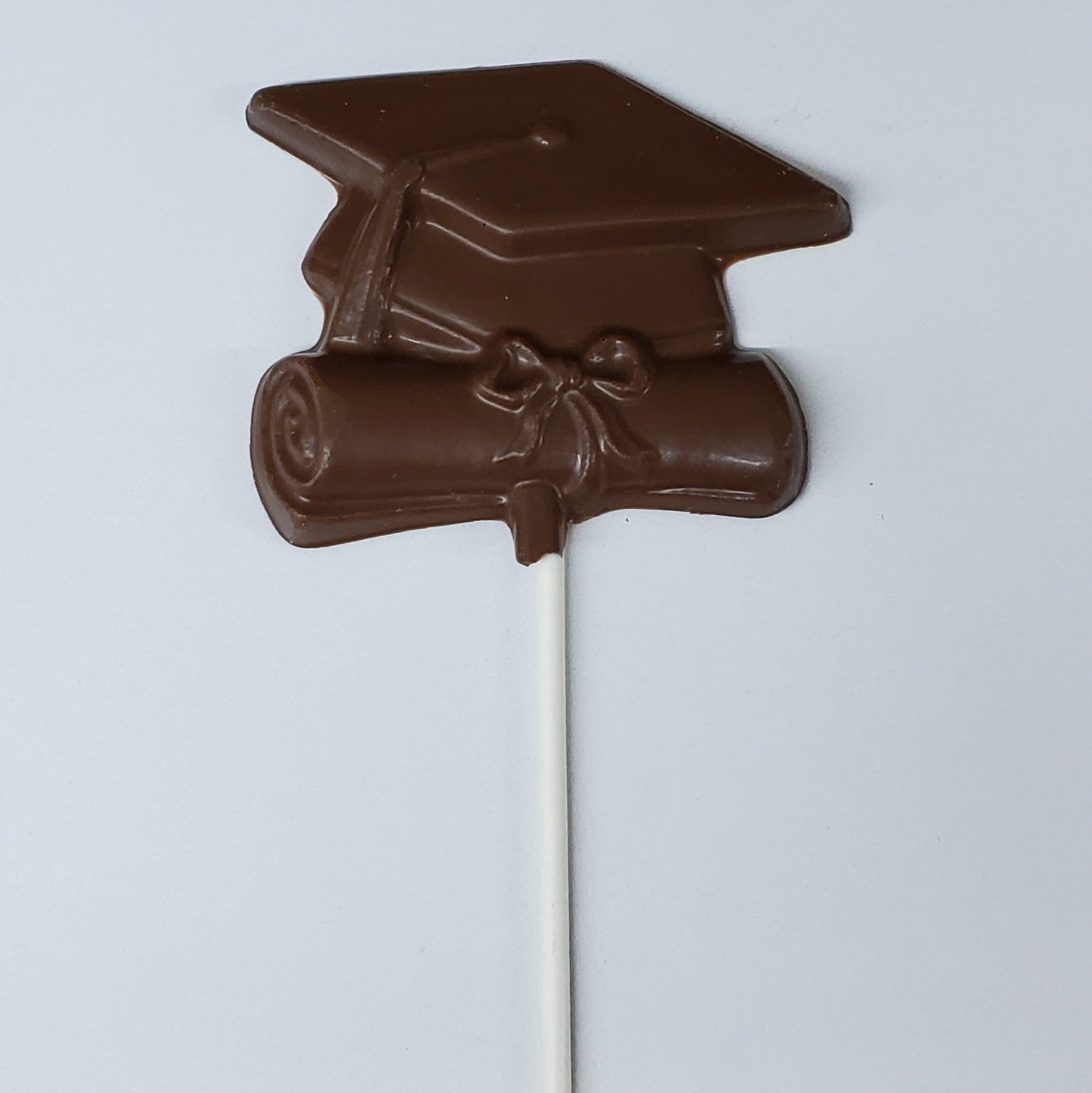 Congratulate your graduate with our Chocolate Graduation lollipop! This celebratory treat features a solid chocolate graduation cap and diploma molded into one delicious piece, perfectly capturing the pride and excitement of this milestone moment. Available in smooth milk chocolate or rich dark chocolate, it's the sweetest way to say "Congratulations!" to graduates of all ages.