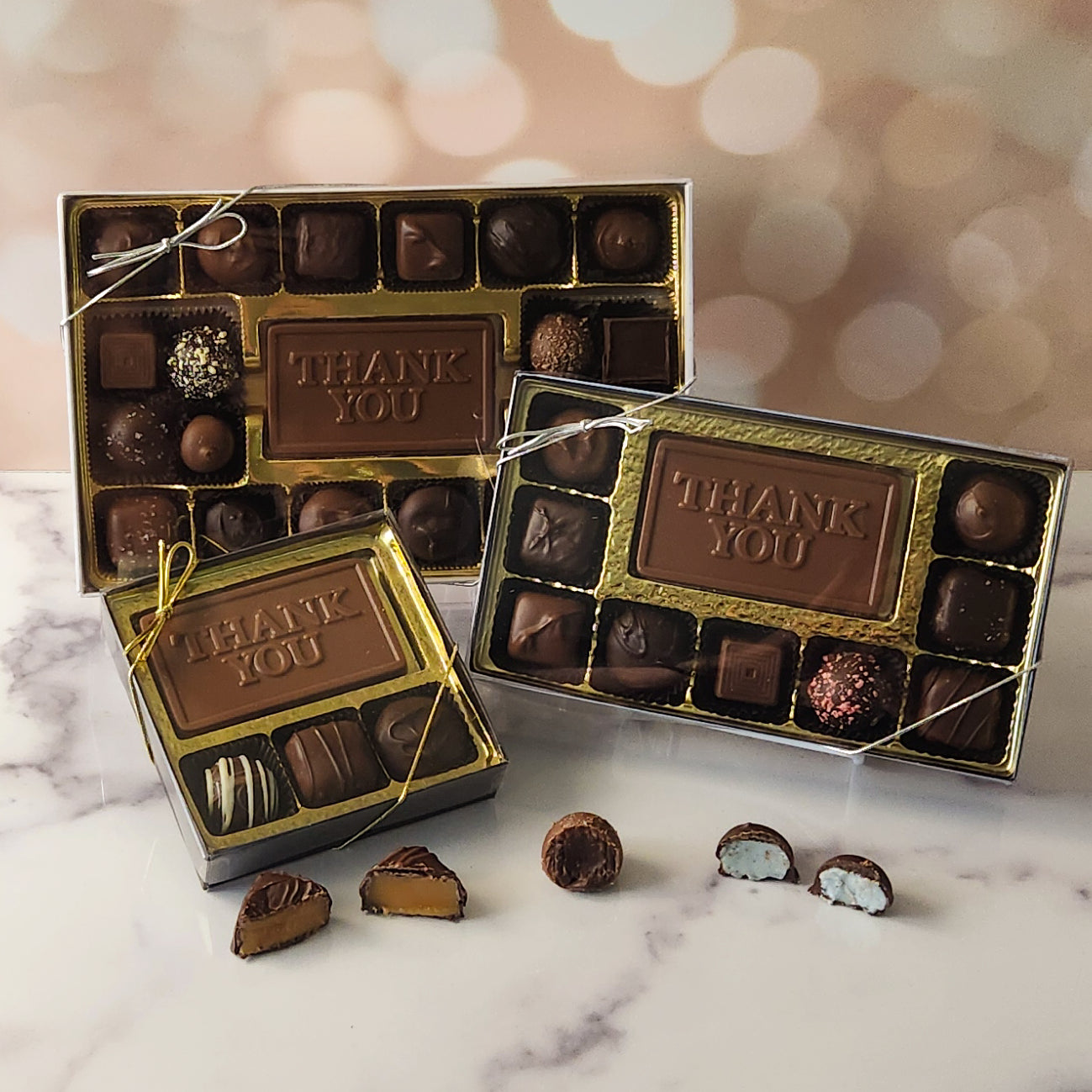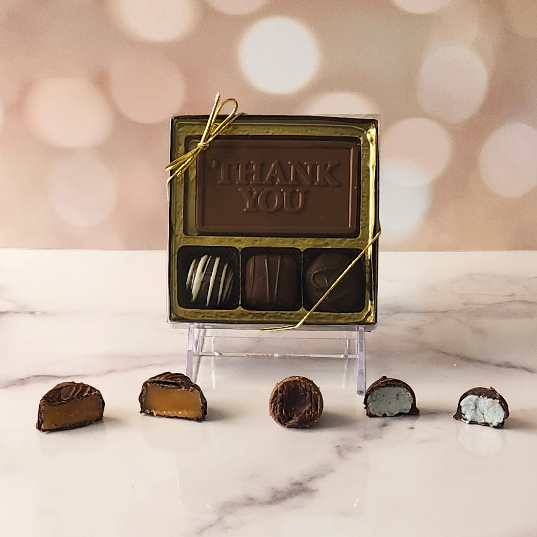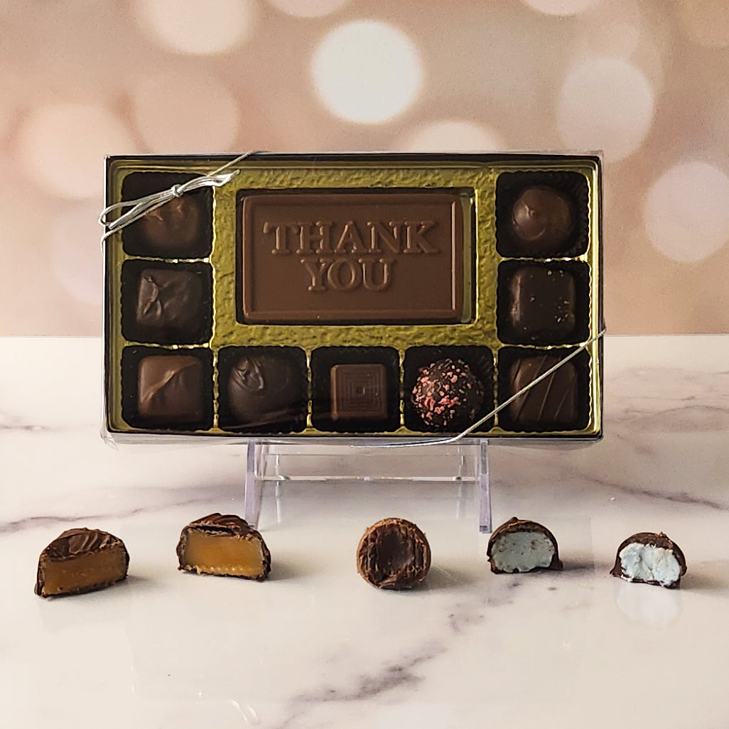 Each box features a beautifully crafted milk chocolate card that says "Thank You," surrounded by an irresistible assortment of milk and dark chocolate soft center creams, luscious caramels, and decadent truffles.